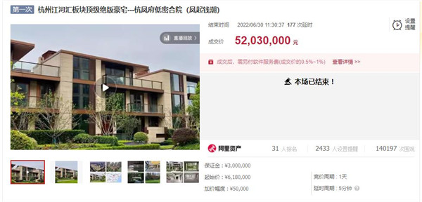 杭凤府,位于最近两年势头最猛的江河汇板块,整个项目仅做了22套合院,在2022年5月开盘时曾经创下了低至10.6%的中签率,引发富豪哄抢。仅仅过了1个多月,杭凤府合院的第一套二手房就出现在阿里资产上,通过竞拍高热度成交,彻底引爆了豪宅市场!该标的以将近评估价1折的618万元起拍,曾引发14万人次围观、31人报名,交保金额近1亿元。后经过247轮竞价,最终以5203万元成交。短短50天左右的时间,房东赚进千万。