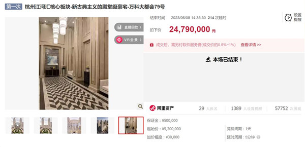 无独有偶。6月8日,在阿里资产上又成交了一套杭州江河汇核心板块的稀缺豪宅,叫好又叫座!一套205㎡的万科大都会79号二手房,以2479万的总价成功售出,折合单价12.05万元/㎡。5万余人围观,29人缴纳50万保证金报名,最后经过214次延时、369次出价,从早上10点一直激烈竞价到下午14:35,最终成交价是起拍价的近5倍!