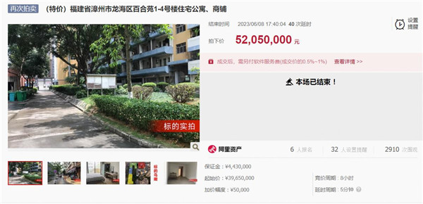 近期,招商福建区域,又在阿里资产上高效去化处置了一件大宗资产。该标的一共上拍了4次,第二轮8折,第三轮8折,而第四轮以7折3965万起拍,吸引了2518人围观、6人报名,最终以5205万成交,顺利成交,且实现了溢价31%!