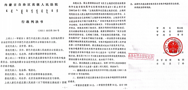 更值得关注的是,2021年,呼伦贝尔市中级法院作出的(2021)内07行初11号行政判决书,曾再次确认了这一权属事实。内蒙古高级法院作出的(2021)内行终584号行政判决书虽然撤销了该11号行政判决书,新巴尔虎左旗政府胜诉,不需要就两个嘎查的草原划界争议重新作出裁决,但是这个584号行政判决书同样没有否定旗政府1997年颁发的甘珠尔嘎查草原所有权证。