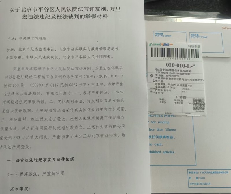 2025年8月9日,伟鹏公司正式向中央第十巡视组、北京市纪委监委等多部门邮寄举报材料,指控平谷区法院法官许友刚、万里宏在审理中涉嫌程序违法、证据采信失当、枉法裁判。