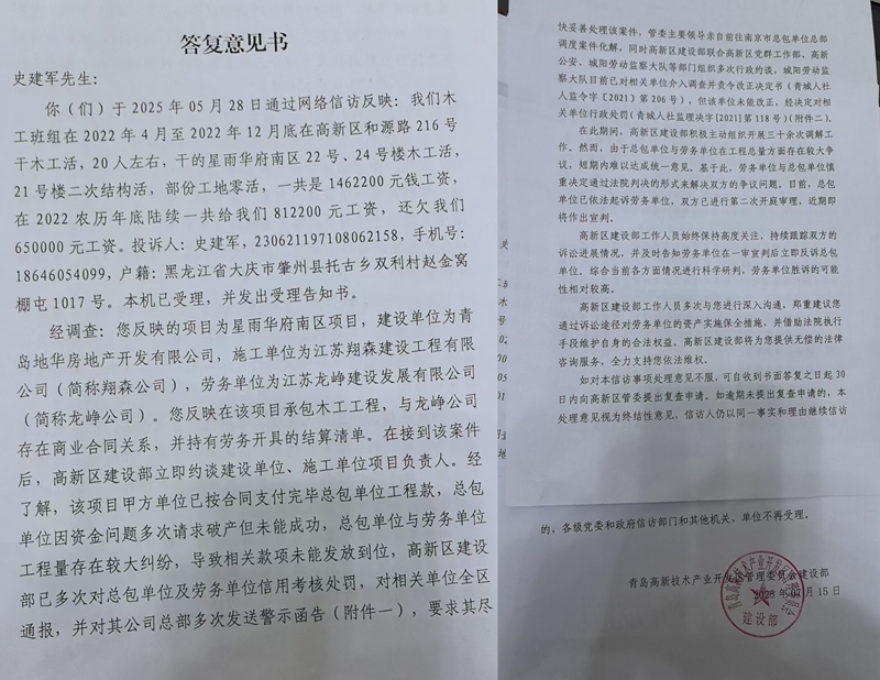 青岛高新技术产业开发区管理委员会建设部出具的答复意见书(信访件编号WT370000202410155398签发人:周松)证实了农民工们反映的问题。