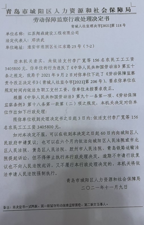 但建设部出具的答复意见书称管委会做了很多工作:为解决问题,高新区建设部采取了一系列措施,多次对总包单位及劳务单位进行信用考核处罚、全区通报,并向其公司总部发送警示函,管委主要领导还亲赴南京调度案件化解。此外,高新区建设部还联合党群工作部、高新公安、城阳劳动监察大队等部门多次约谈相关单位,城阳劳动监察大队也已介入调查,下达责令改正决定书并作出行政处罚,但问题依然未能得到解决。