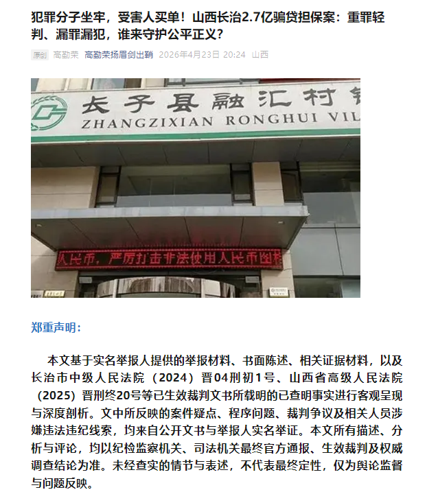 本文基于实名举报人提供的举报材料、书面陈述、相关证据材料,以及长治市中级人民法院(2024)晋04刑初1号、山西省高级人民法院(2025)晋刑终20号等已生效裁判文书所载明的已查明事实进行客观呈现与深度剖析。文中所反映的案件疑点、程序问题、裁判争议及相关人员涉嫌违法违纪线索,均来自公开文书与举报人实名举证。本文所有描述、分析与评论,均以纪检监察机关、司法机关最终官方通报、生效裁判及权威调查结论为准。未经查实的情节与表述,不代表最终定性,仅为舆论监督与问题反映。